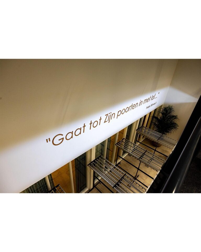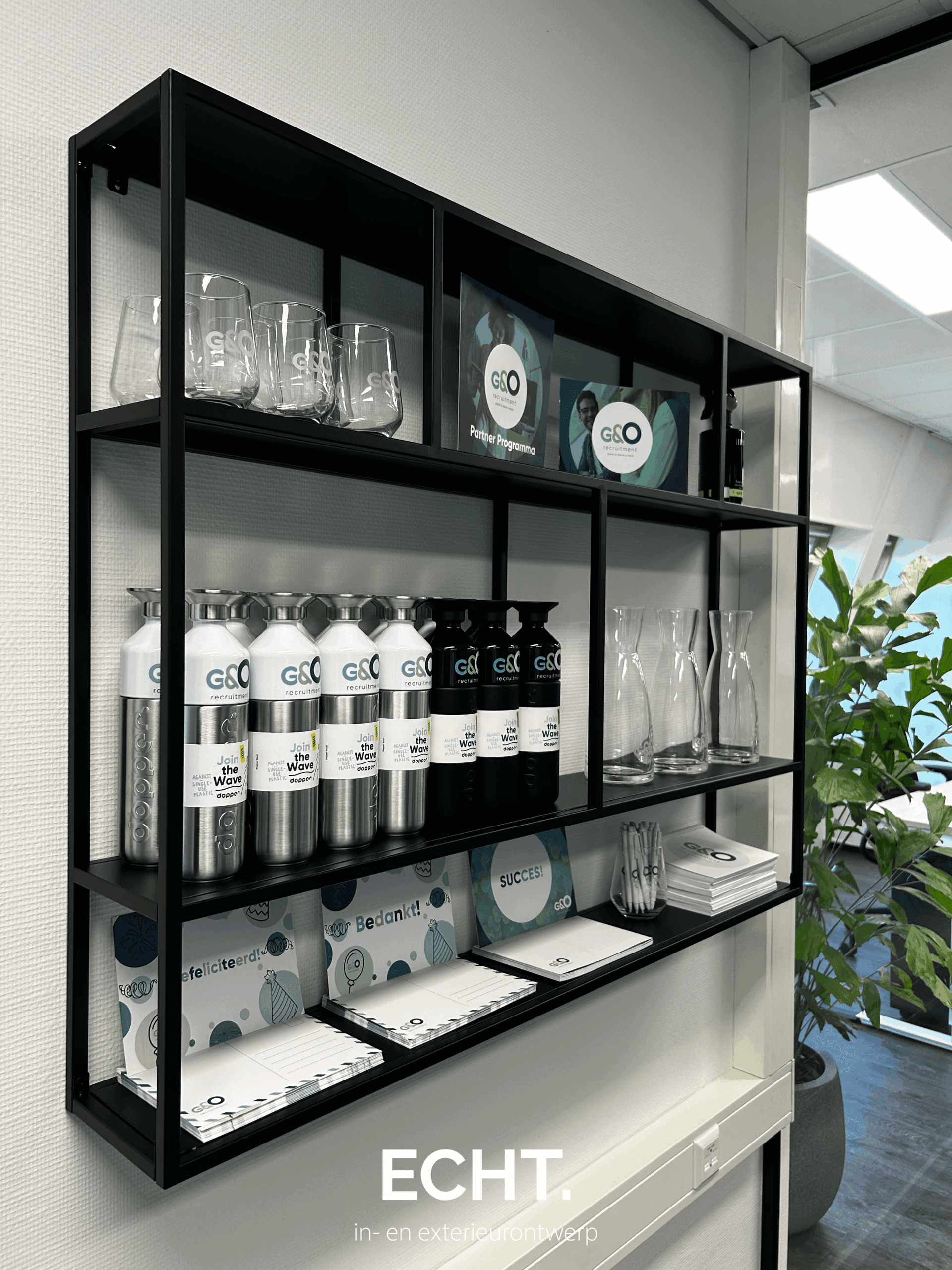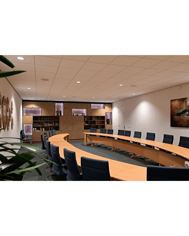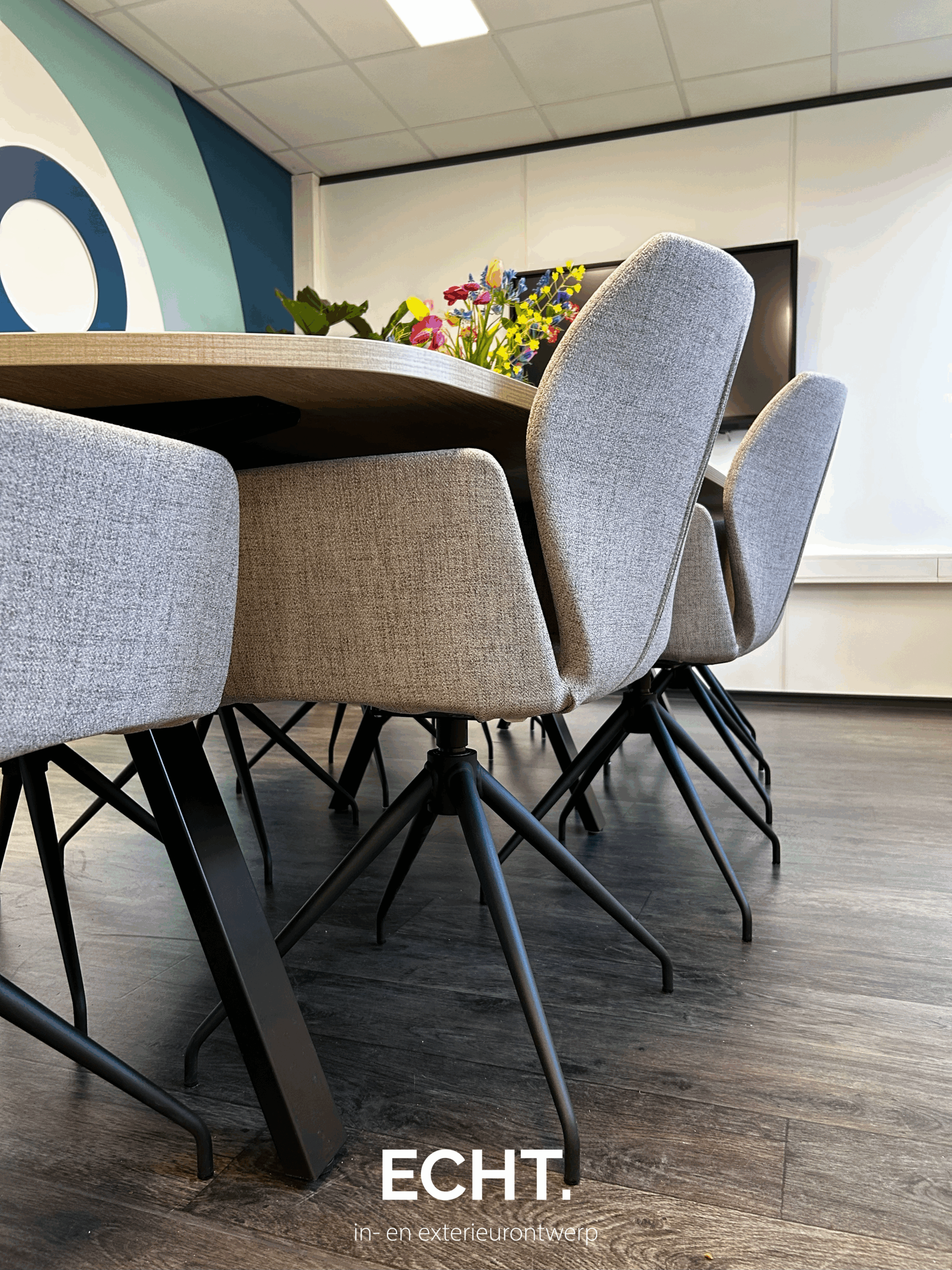 In deze vergaderruimte is gekozen voor een moderne, zakelijke uitstraling met een subtiele groene touch en een herkenbare merkidentiteit. De opvallende wand met het logo in huisstijlkleuren zorgt voor directe herkenning. In de open kast is ruimte voor merchandise van de organisatie, zoals een dopper met logo en drukwerk dat het verhaal van de organisatie onderstreept. De royale vergadertafel is geschikt voor teamoverleg en formele bijeenkomsten zoals klantgesprekken en sollicitaties.