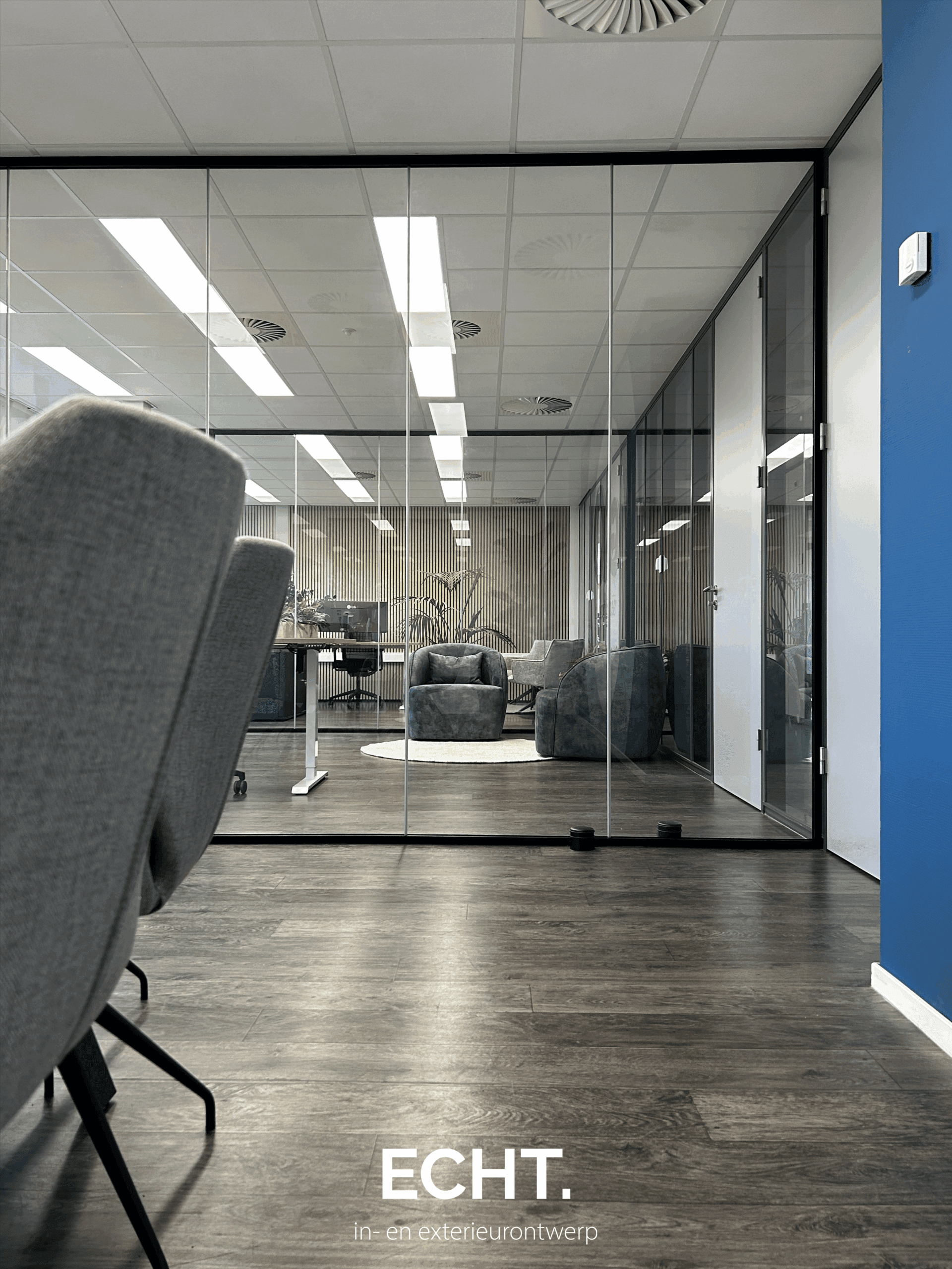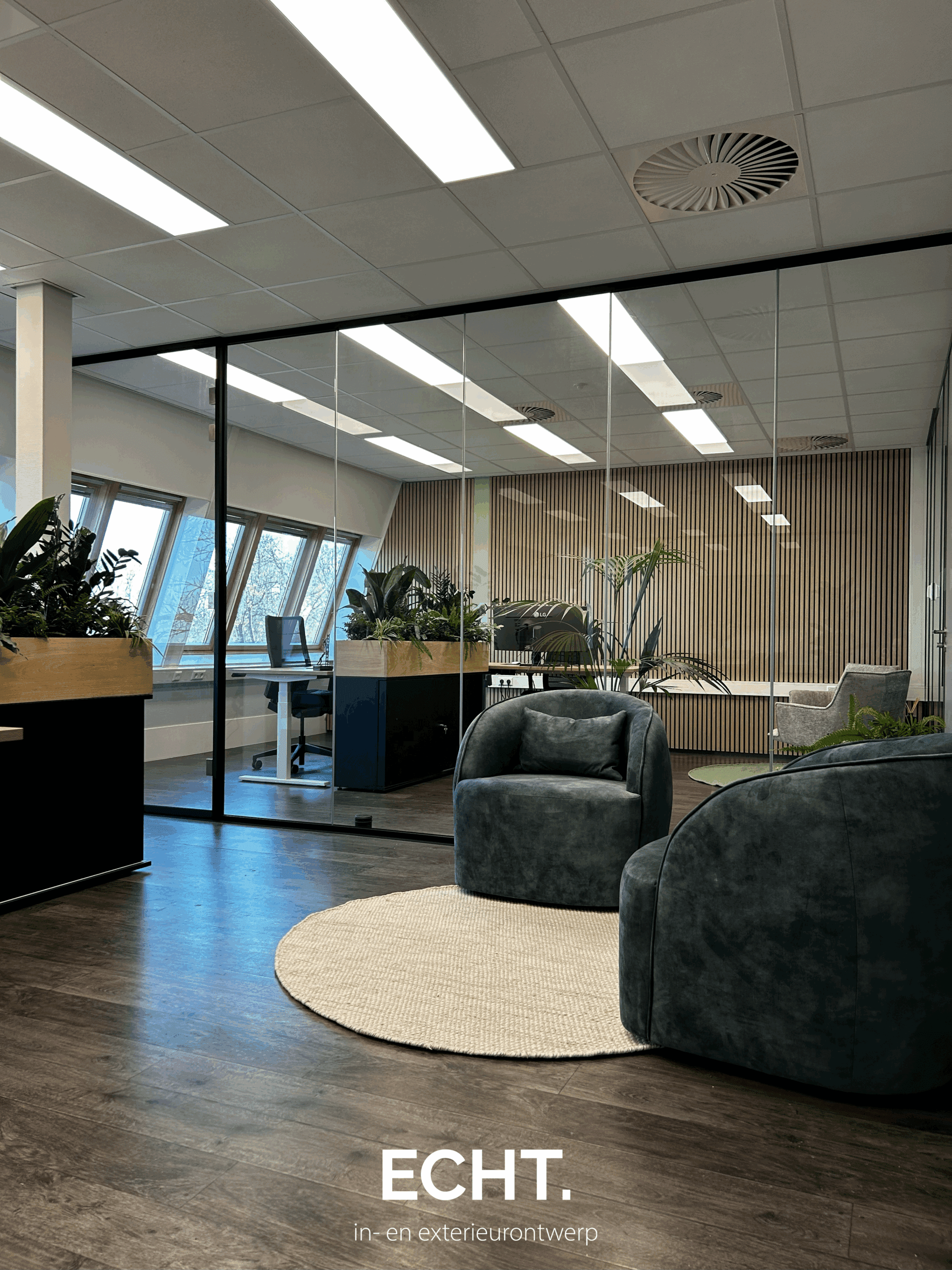 De kantoorruimtes zijn ontworpen met oog voor functionaliteit, openheid en representativiteit. Door het gebruik van glazen wanden ontstaat er een transparante, open werksfeer die aansluit bij de bedrijfscultuur: korte lijnen, toegankelijkheid en persoonlijk contact. De inrichting is strak en modern, met stoere zwarte accenten, warme houttinten in plantenbakken en akoestische panelen en veel groen. Dit zorgt voor een gebalanceerde, professionele uitstraling zonder in te leveren op sfeer. Naast de werkplekken is er per kantoorruimte ook een informeel zitje gecreëerd – ideaal voor korte overleggen of een persoonlijk gesprek in een ontspannen setting.