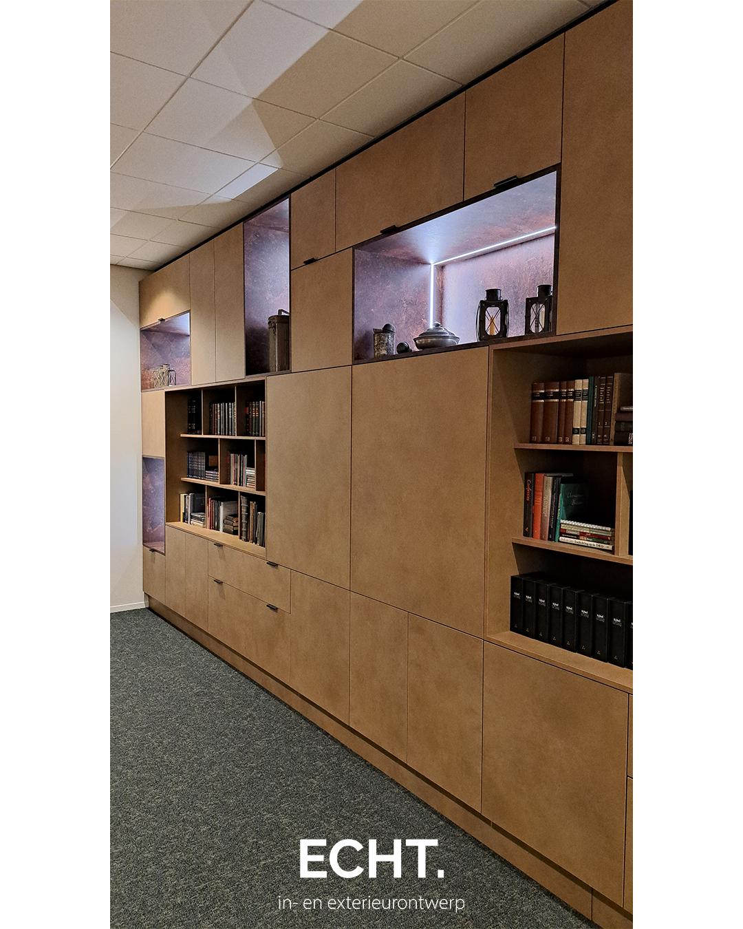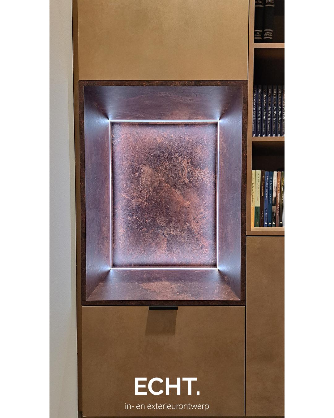 Maatwerk elementen bieden de mogelijkheid om net iets extra’s toe te voegen aan de ruimte. ECHT. ontwierp deze volledig op maat gemaakte kast, waarin functionaliteit en design samenkomen. De dichte vakken bieden praktische opbergruimte, terwijl de open vakken plek creëren voor objecten met een herinnering. Geïntegreerde LED-strips zorgen voor sfeervolle accentverlichting, met kleuren die aanpasbaar zijn aan elke gewenste sfeer of activiteit.
