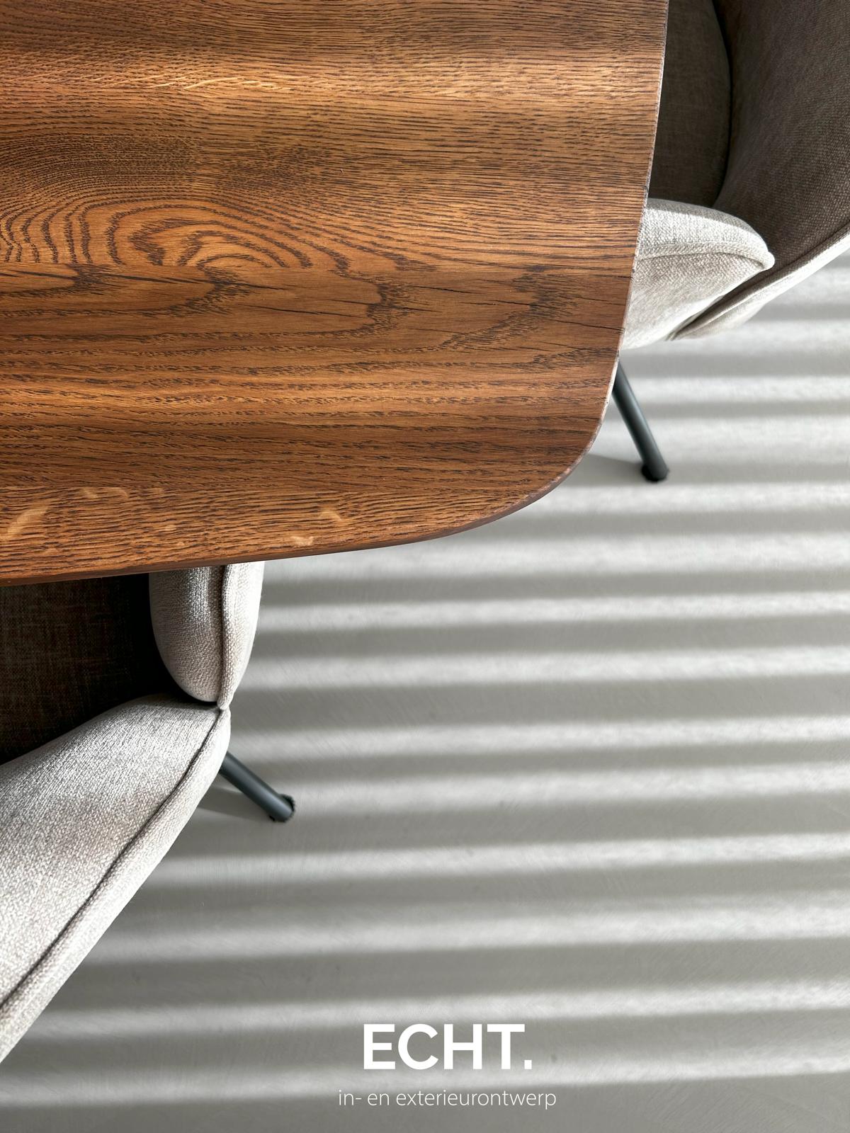 Hoe tof is deze royale eettafelset, perfect voor lange avonden tafelen met goed gezelschap. Het eiken tafelblad in de diepwarme kleur Espresso en de zachte zandtint van de eetkamerstoelen combineren comfort en stijl. De afgeronde hoeken, stalen poten en verjongde randafwerking zijn zowel stoer en robuust als verfijnd en sfeervol. Dé ideale basis voor deze moderne interieurrealisatie.